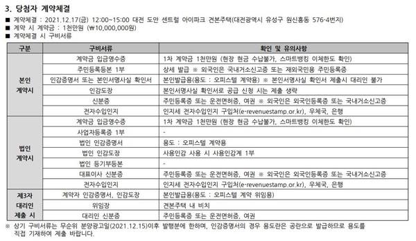 계약체결 시 구비서류는 본인 계약 시 계약금 입금영수증, 주민등록등본 1부, 인감증명서 또는 본인서명사실 확인서 등이 필요하다. 자세한 사항은 당사 홈페이지를 참고하거나 전화(☎042)826-0377)로 문의할 수 있다.