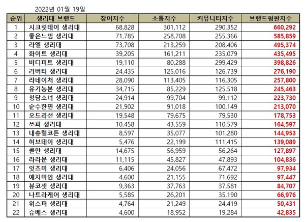 2022년 1월 생리대 브랜드평판 순위는 시크릿데이, 좋은느낌, 라엘, 화이트, 바디피트, 리버티, 라네이처, 유기농본, 청담소녀, 순수한면, 오드리선, 쏘피, 내츄럴코튼, 허브데이, 콜만, 라라문, 잇츠미, 예지미인, 뷰코셋, 나트라케어, 위스퍼, 슈베스 순으로 분석됐다.