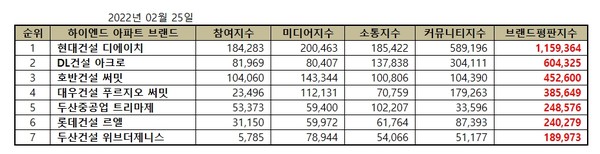 한국기업평판연구소는 7개 하이엔드 아파트 브랜드에 대한 빅데이터 평판분석했다. 2022년 1월 25일부터 2022년 2월 25일까지의 국내 아파트 브랜드 빅데이터 3,280,765개를 분석하여 소비자들의 행동분석을 했다.