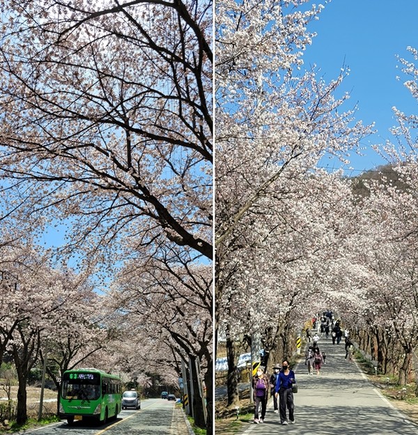 국립수목원이 선정한 '아름다운 벚꽃길 20선'에 포함됐을 정도로 낮이나 밤이나 벚꽃의 찬란한 모습이 눈을 즐겁게 하다보니 평일(금요일) 오전임에도 많은 사람들이 있었다. 비록 코로나19 상황에 '대청호 벚꽃축제'가 비대면 방식으로 바뀌었지만 말이다.