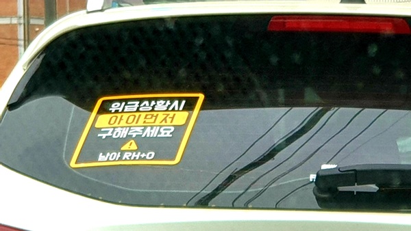 <사진>에서는 아이가 타고 있고 혈액형이 무엇이며 RH형은 어떠하다고 상세히 알려준다. 우리 사회 시민의식의 수준 향상과 자동차 문화가 제대로 자리 잡힌 듯해 인상적이었다. 자동차 뒷유리창에 부착된 바로 이런 표지가 특수상황에서 신속한 대처를 도울 수 있을 것이다. 기왕이면 이런 내용을 유리창에 붙박이로 새기기보다는 아이가 탑승하였을 때만 부착하고 평소에는 떼놓는 세심한 배려가 필요해 보인다.