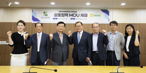 건양사이버대학교 이원묵 총장(왼쪽 세 번째)과 탄동농협 이병열 조합장(왼쪽 네 번째)이 25일 상호 협력 및 발전을 위한 업무협약을 체결한 후 기념촬영을 하고 있다. 협약에 따라 두 기관은 ▲탄동농협 조합원 및 직원(가족) 입학 시 입학금 면제 및 장학금 지원 ▲입학생 김안과병원, 건양대병원, 장례식장 이용 시 이용료 감면 혜택 ▲기타 양 기관의 상호 발전을 위한 정보 교류, 교육 및 홍보 등에 힘쓸 계획이다.