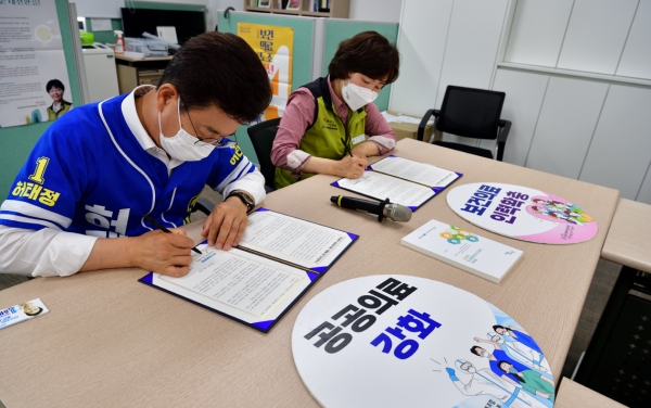 전국보건의료산업노동조합 대전충남지역본부 조혜숙 본부장(오른쪽)과 더불어민주당 허태정 대전시장 후보가 25일 보건의료정책협약서에 서명하고 있다. 협약을 통해 허 후보는 9.2 노정합의 성실 이행, 대전의료원 병상 확대 계획 수립 및 설계 반영, 보건의료인력 확보 및 안정적 수급 위한 방안 마련에 힘쓰기로 했다.