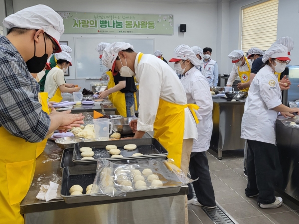 이날 봉사활동은 정석완 사장을 비롯한 임직원이 재료 손질부터 반죽, 빵 만들기 등 모든 과정에 직접 참여해 나눔의 의미를 더했다.
