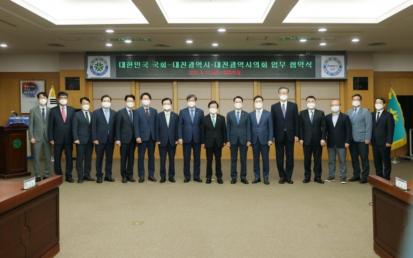 대전시는 최근 대전시청에서 국회사무처와 ‘국회통합디지털센터 내 시민개방 복합문화공간 조성 업무협약식’을, 국회도서관과 ‘지식정보의 공유·확산을 위한 업무협약식’을 각각 가졌다고 29일 밝혔다. 협약으로 시와 국회사무처는 디지털센터 내에 시민개방 복합문화공간을 조성하고 시민공간을 내실화 있게 운영하기 위해 프로그램 및 콘텐츠 개발·활용을 위해 긴밀하게 협력한다. 국회사무처는 시민개방 복합문화공간 조성이 조기에 완료될 수 있도록 예산 확보 및 집행에 노력한다. 국회도서관은 지식정보의 공유·확산을 위해 디지털 도서관 구축, 국회전자도서관 원문 데이터베이스 이용 확대와 협력, 디지털 정보자원의 상호 공유 및 활용 등을 위해 노력한다.