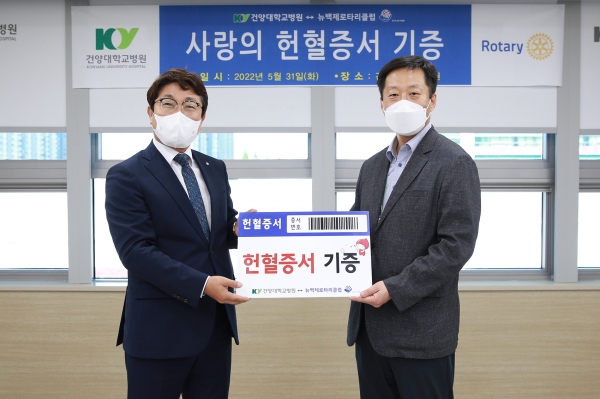 뉴백제로타리클럽 김종호 회장(왼쪽)이 최근 건양대병원 김덕중 원무부장에게 헌혈증서를 기증하고 기념촬영을 하고 있다. 이날 기부받은 헌혈증은 100여 장이다.