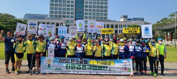 전국자전거길잇기국민연합과 ㈔자전거사랑전국연합회 대전본부 회원들이 2일 대전시청 남문에서 탄소중립 실천운동 자전거 캠페인을 실시하고 있다. 생활 속 자전거 이용 활성화로 2050 탄소중립을 실현하는 해당 캠페인은 서울에서 출발해 전국을 자전거로 순회하며 탄소중립 실천운동을 홍보하고 있다.
