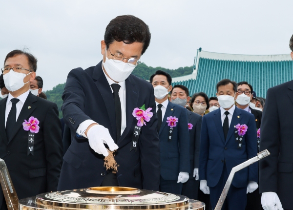 허태정 대전시장이 6일 국립대전현충원에서 국가유공자, 보훈가족, 학생, 일반시민 등과 함께 순국선열과 호국영령의 희생과 공헌을 기리며 참배하고 있다. 이후