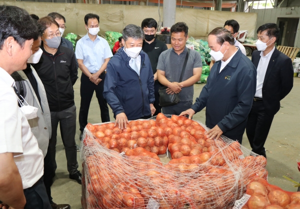 농협 대전지역본부 정낙선 본부장(앞줄 오른쪽 세 번째)이 16일 새벽, 대전 노은동 농수산물도매시장 내 대전원예농협공판장을 방문해 농산물 수급상황 및 가격동향을 점검하고 현장직원들을 격려하고 있다. 이날 정 본부장은 최근 농산물 수급 불안정으로 물가상승이 지속되는 상황을 감안해 서민경제와 밀접한 주요 농산물의 출하물량 및 경락 시세를 점검했다.