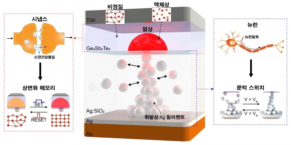 KAIST 신소재공학과 이건재 교수팀이 100nm(나노미터) 두께의 단일 소자에서 뉴런과 시냅스를 동시에 모사하는 뉴로모픽 메모리를 개발했다. 이 교수팀은 인간의 뇌처럼 뉴런과 시냅스가 유기적으로 동작하는 방식의 단일 메모리 소자를 최초로 구현했으며 이를 통해 반도체 소자로 인간 뇌를 완전히 구현하는 뉴로모픽 컴퓨팅 본연의 목표 달성에 근접할 수 있을 것으로 기대된다.