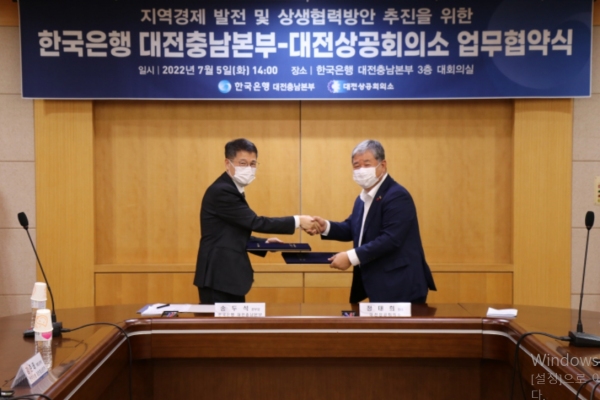 한국은행 대전충남본부와 대전상공회의소가 5일 한국은행 대전충남본부 대회의실에서, 지역경제 발전 및 상생협력방안 추진을 위한 업무협약을 체결했다.
