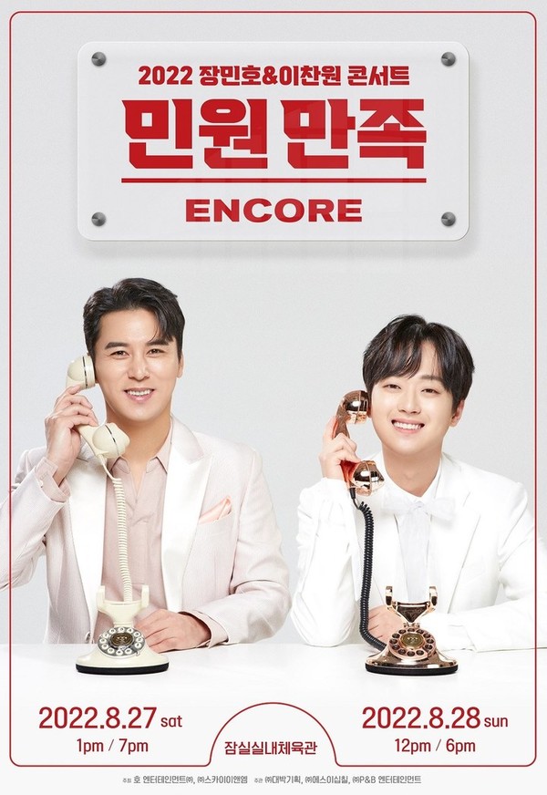 장민호와 이찬원은 다음 달 27~28일 서울 잠실 실내체육관에서 '민원만족' 앵콜 콘서트 4회 개최를 확정했다. 팬들의 뜨거운 관심에 보답하고자 공연을 추가했다.