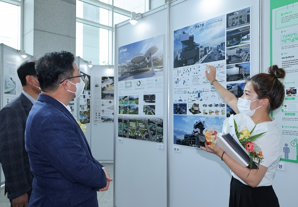 22일 대전시청에서 제14회 대전시 공공디자인 공모전 시상식이 열려 이장우 대전시장(왼쪽)이 수상자로부터 작품에 대한 설명을 듣고 있다. ‘도시를 디자인하다, 삶을 디자인하다’를 주제로 진행된 이번 공모전에는 대학생과 일반인 등 315명이 참여했으며 183개 출품작품 중 59개 작품이 최종 수상작으로 결정됐다. 대상은 공간디자인 부문에 출품한 와이앤피디자인건축사사무소 박훈‧최민욱 씨의 ‘대나무숲 사랑채’가 선정됐다.