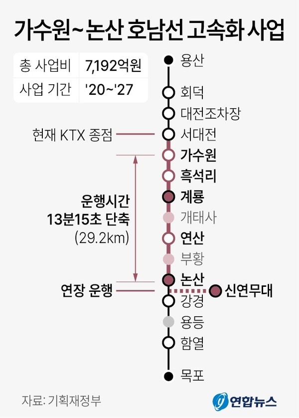 호남선 고속화 사업이 예타를 통과하면서 국토교통부는 내년부터 7779억 원을 전액 국비로 투입해 2027년 준공(설계 3년, 공사 5년)을 목표로 29.2㎞ 구간의 굴곡 노선 직선화 및 선로 개량 공사를 추진한다.