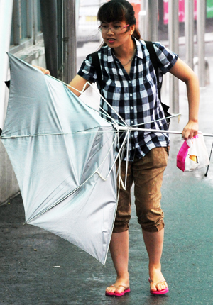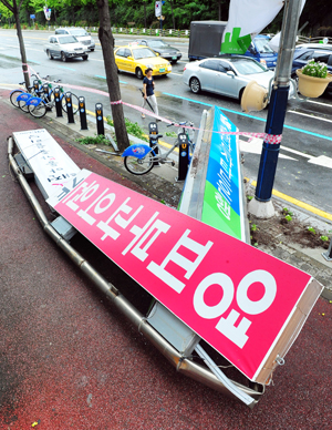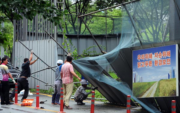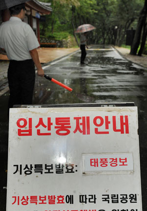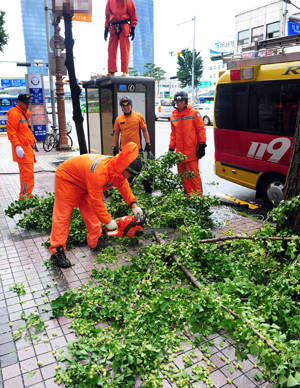 공사현장의 가림막이 쓰러지자 관계자들이 복구작업을 펼치고 있다.강풍에 쓰러진 나무를 119 소방대원들이 2차 피해 예방을 위해 자르고 있다. 강풍에 떨어진 간판들이 인도에 널려있어 보행자들이 피해 가고 있다. 강풍에 우산이 망가지자 한 시민이 당황해하고 있다.계룡산 국립공원이 태풍경보로 입산이 통제되고 있다. 강풍에 날아온 조립식 건물의 지붕이 태안군 국방과학연구소 인근 도로에 널려 있어 포크레인을 동원해 수거작업을 벌이고 있다. 대전 둔산동 선사유적지 정류장이 강풍에 파손돼 인도에 넘어져 있는 가운데 관계자들이 시설 해체작업을 벌이고 있다.
