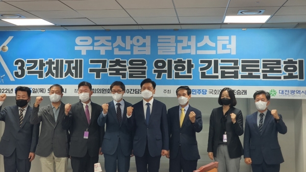 우주산업을 이끌 주역들이 한자리에 모여‘우주산업 클러스터 3각 체제 구축’방안을 모색했다. 더불어민주당 조승래 의원(대전 유성구갑) 주최로 15일 국회에서 열린 우주산업 클러스터 3각 체제 구축 토론회에는 이석봉 대전시 경제과학부시장, 과기정통부 윤미란 팀장, 항공우주연구원 신명호 연구원, 대전테크노파크 권성수 ICT융합센터장, ㈜솔탑 사공영보 대표 등 산·학·연·관 관계자들이 모여 열띤 토론을 벌였다. 이 부시장은 “우주산업 3각 체제 조성은 대전의 연구·인재 개발, 경남의 위성 산업, 전남의 발사체 산업이 조화를 이뤄 국가 우주 경쟁력을 드높일 기회”라며 “우주 연구개발의 핵심지인 대전이 우주산업 클러스터 조성의 핵심 역할을 담당하겠다”고 말했다.