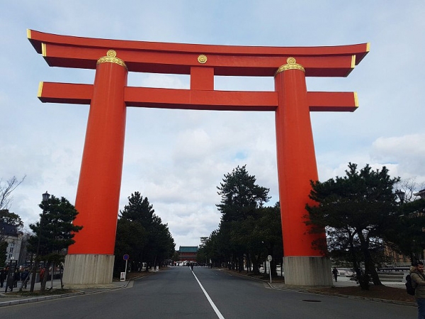 천황을 신으로 모시는 헤이안 신궁도 신사의 하나로서 입구의 거대한 붉은색 도리이가 시선을 잡는데, 헤이안 신궁은 전체 약 2만 평 대지 중 헤이안 신궁이 약 1만 평이고, 정원이 약 1만 평이다. 도리이를 지나면 신궁의 정문인 응천문(應天門)이다.