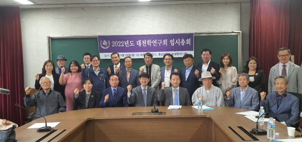 26일 충남대학교 농업생명과학대학에서 2022년 ㈔대전학연구회 임시총회가 열린 가운데 강병수 충남대 명예교수(앞 줄 오른쪽 네 번째)를 비롯해 관계자들이 기념촬영을 하고 있다. 연구회는 지역의 현안과 이슈에 등에 대해 연구하고 있는 단체다. 신성재 기자