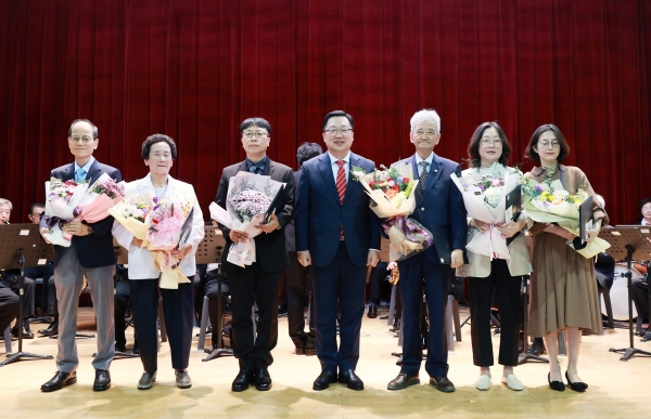 지난달 30일 대전시노인복지회관에서 제26회 노인의 날 기념행사가 열린 가운데 이장우 시장(왼쪽 네 번째)이 노인복지 유공자들과 함께 기념촬영을 하고 있다.