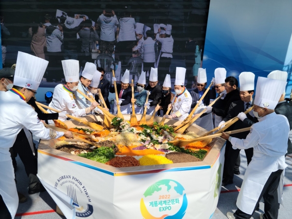 엑스포조직위는 이날 행사장 상설무대에서 대형 비빔밥 만들기 퍼포먼스를 가졌다.