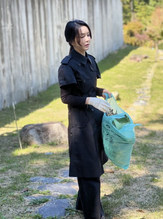이날 대통령실이 공개한 사진에서 검은 옷차림의 김 여사는 묘소 앞에 두 손을 모으고 고개를 숙여 참배했다. 또 목장갑을 끼고 묘역 주변 쓰레기를 줍는가 하면, 한 쪽에서 참모로 보이는 한 여성과 함께 쭈그리고 앉아 묘소를 바라보는 모습도 볼수있다.