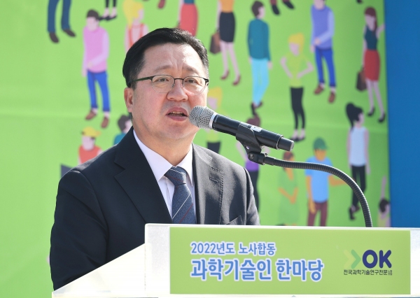 이장우 대전시장이 27일‘2022 노사합동 과학기술인 한마당’을 찾아 행사 개막을 축하하고 있다.