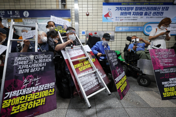 지난달 30일 공식 성명을 통해 전장연은 "지난 29일 이태원에서 일어난 비극적인 참사로 고통과 공포 속에서 돌아가신 분들의 명복을 빈다"고 밝혔다. 이어 "돌아가신 분들에 대한 추모 기간을 가지기로 했다"고 덧붙였다.