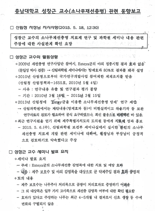 산림학계 관계자는 “재선충병이 활개를 치는데도, 국내에 백신기업이 있는데도 주목받지 못한 것에는 이유가 있다. 이제는 환경·경제적 국익을 생각해서라도 무슨 일이 있었는지 국민이 알아야 한다”고 말했다.