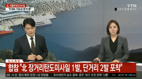 [속보] 북한, 장거리탄도미사일 1발·단거리 2발 포착 저작권자 © 금강일보 무단전재 및 재배포 금지 김미영 기자 kmy@ggilbo.com 다른기사 보기 SNS 기사보내기 이메일(으)로 기사보내기 다른 공유 찾기 기사스크랩하기 댓글삭제 삭제한 댓글은 다시 복구할 수 없습니다. 그래도 삭제하시겠습니까? 비밀번호 닫기 기사 댓글 0 댓글 접기 댓글입력 권한이 없습니다. 댓글 내용입력 비회원 로그인 이름 비밀번호 댓글 내용입력 댓글쓰기 계정을 선택하시면 로그인·계정인증을 통해 댓글을 남기실 수 있습니다. 회원 로그인 비회원 글쓰기 이름 비밀번호 자동등록방지 로그인 옵션 창닫기 추천기사 [오늘의 금값시세] 11월 26일 금시세(순금·24k)는? 노타 주가, 급등... 호재는? [오늘의 운세] 26일 수요일 나의 운세는?
