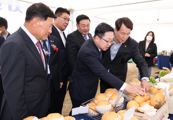 이장우 대전시장(오른쪽 두 번째)이 3일 대전농업기술센터에게 열린‘제34회 대전농업인의 날’ 기념행사를 찾아 농업인을 격려하고 함께 열린 우수농산물 전시회에서 전시된 과일을 살피고 있다. 이 시장은“농업인의 긍지와 자부심을 고취시키는 동시에 도농이 상생하는 분위기를 조성을 위해 더욱 노력하겠다”라고 말했다.