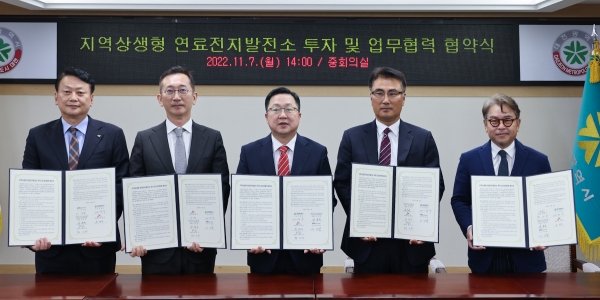 대전시는 7일 시청에서 SK가스, LS일렉트릭, CNCITY에너지, 연료전지사업추진위원회 등과 지역상생형 연료전지발전소 건립을 위한 투자 및 업무협약을 체결했다고 밝혔다. 협약을 통해 SK가스와 LS일레트릭은 내년부터 3500억 원을 투입, 서구 평촌산업단지 1만 8000㎡부지에 40㎿ 규모의 연료전지발전소를 건설한다. CNCITY에너지는 도시가스 배관을 투자하고 가스공급에 나서기로 했다. 시는 인·허가 등 행정절차를 신속하게 지원하고 추진위는 발전소 건설과정의 원활한 공사를 위해 협조한다. 연료전지발전소가 성공적으로 들어서면 2019년 기준 1.9%인 대전의 전력자립도를 5.1% 끌어올릴 수 있다. 또 투자와 연료전지발전소 가동 등을 통해 지역에 1045명의 일자리가 창출되고 도시가스 미공급지역의 조기공급으로 기성동 지역 에너지 복지도 가능하다. 특히 연료전지 발전은 일반 화력발전에 비해 공해물질을 거의 배출하지 않아 이산화탄소배출량도 크게 줄어 탄소중립도 실현할 수 있다.