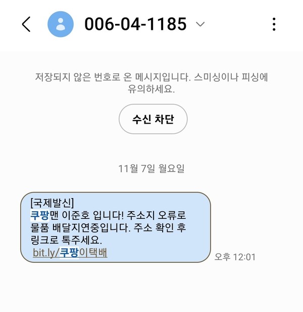 언뜻 보면 정말 배송오류로 인한 쿠팡맨의 문자메시지 같아 보이지만, 해당 문자는 [국제발신] 이라는 문구가 붙어있다. 번호 역시 `001`로 시작하는 만큼 해외에서 발송된 문자로 추정된다.