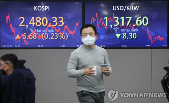 이날 코스피는 전 거래일보다 5.68포인트(0.23%) 오른 2,480.33에 장을 마쳤다.