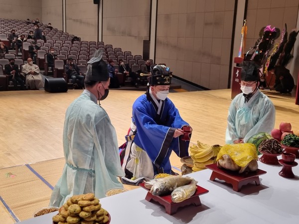 29일 옥천문화원에서 육영수 여사 탄신 97주년 숭모제가 엄숙한 분위기 속에서 거행된 가운데 육동일 충남대 명예교수가 옥천 육씨 종친회 대표로 참여해 향위에 잔을 올리고 있다. 육 명예교수는 “오랜 기간 잊지 않고 추모해 주시는 옥천지역민들과 육씨 종친회 회원여러분들께 친족을 대표해서 깊이 감사드린다”며 “사랑과 봉사의 손길로 아직도 많은 분들이 가슴에 새겨진 육 여사님의 뜻깊은 탄신을 숭모한다”고 밝혔다. 옥천 육씨 종친회 제공