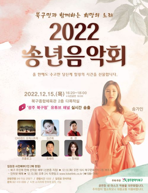 광주 북구는 오는 15일 오후 4시 북구종합체육관 2층 다목적실에서 '북구민과 함께하는 2022년 송년음악회'를 개최한다.