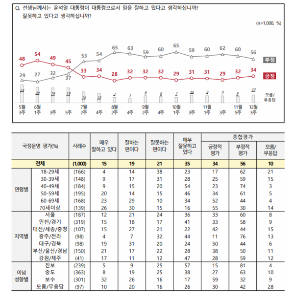 엠브레인퍼블릭, 케이스탯리서치, 코리아리서치, 한국리서치가 지난 12∼14일 만 18세 이상 1000명을 대상으로 진행한 전국지표조사(NBS)에 따르면 윤 대통령이 국정운영을 잘하고 있다는 응답은 34%였다. 지난 조사에 비해 2%p 상승한 수치다. 부정적 평가는 56%로 4%p 감소했다.