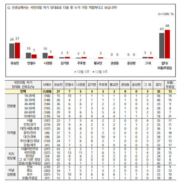 전체 응답자에서는 유승민 전 의원이 가장 앞서나갔지만 국민의힘 지지층으로 한정하면 안철수 의원이 1위를 차지했다.