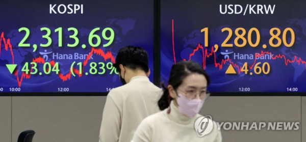 이날 코스피는 전장보다 43.04포인트(1.83%) 하락한 2,313.69로 마감했다.