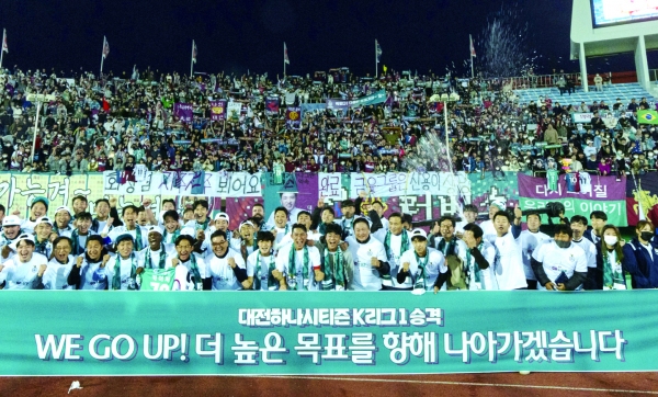 지난 시즌은 대전을 연고로 하는 프로축구 K리그1 대전하나시티즌에겐 뜻깊은 한 해였다. 2022 시즌 K리그 승강플레이오프에서 김천 상무를 총합 6대 1로 꺾고 ‘인생을 걸었던’ 두 번째 도전인 승격에 성공했기 때문이다.