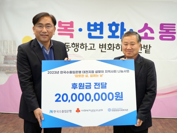 한국수출입은행 대전지점(본부장 이운창)은 11일 취약계층의 따뜻한 설맞이를 위해 2000만 원을 한밭종합사회복지관(관장 오명근)에 전달했다.