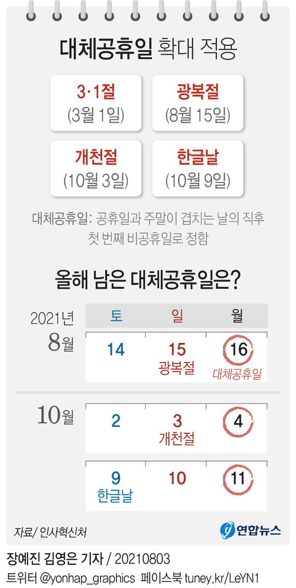 대체공휴일이 과도하게 늘어나면 기업의 부담이 커질 수 있다는 이유로 초반에는 대체공휴일이 설·추석 연휴와 어린이날에만 적용됐다. 올해부터 삼일절, 광복절, 개천절, 한글날 등 국경일에도 확대됐다.