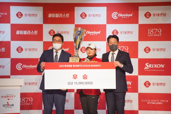 지난 29일 대전 골프존조이마루 경기장에서 열린 ‘2023 롯데렌탈 롯데렌터카 GTOUR 여자대회’ 1차 결선 시상식에서 (왼쪽부터)골프존 손장순 상무, 우승자 홍현지, 롯데렌탈 최근영 부문장이 기념 촬영을 하고 있다.