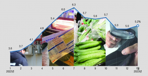 2일 통계청이 발표한 ‘2023년 1월 소비자물가동향’에 따르면 지난달 소비자물가지수는 110.11(2020년=100)로 전년 동월 대비 5.2% 상승했다. 지난해 5월(5.4%) 이후 9개월째 5% 이상의 고물가 상황이 이어지고 있는 데다 물가 상승폭마저 전월(5.0%)보다 0.2%포인트 확대됐다. 물가 상승폭이 전월보다 확대된 건 지난해 10월(0.1%포인트) 이후 석 달만이다.