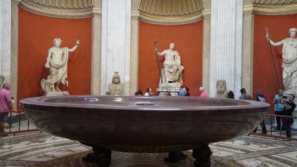 그런데, 로마 시내의 팡테온 신전은 BC 27년 로마 제국의 초대 황제 아우구스투스의 양자이자 사위인 아그리파 황제(Agrippa)가 로마의 모든 신들을 위하여 지은 신전이었는데, 베드로 성당을 지을 때 팡테온 신전의 조형물을 뜯어왔으면서도 솔방울의 양쪽에 있는 공작새는 교황청을 상징하고, 뒤편의 독수리는 권력을, 솔방울 위의 둥근 돔 모형은 팡테온 신전을 모방했다고 하는 것은 견강부회라는 생각을 감출 수 없다. 게다가 피냐 정원 이외에 네로황제의 욕조와 로마 제국 시대의 황제들 석상을 벽면에 빙 둘러 세운 ‘원형의 방’도 팡테온 신전처럼 채광을 위하여 뻥 뚫었다.(자세히는 2023. 1.11. 팡테온 신전 참조)