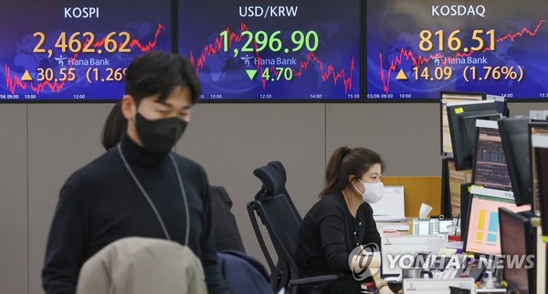 이날 코스피는 전장보다 30.55포인트(1.26%) 오른 2,462.62로 장을 끝냈다.