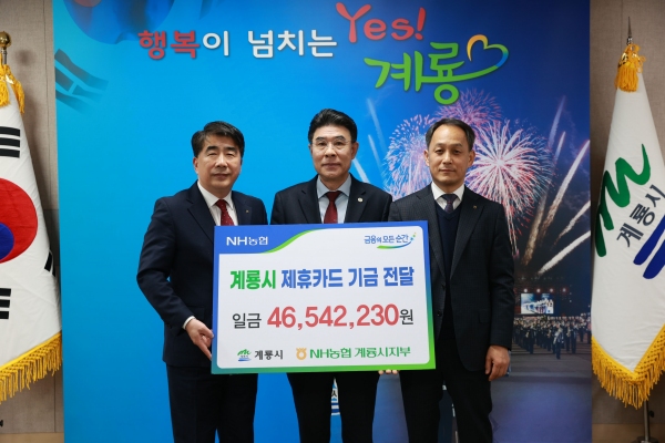 계룡시가 농협 계룡시지부로부터 제휴카드 기금 4600여만 원을 전달받았다. 시는 지난 9일 ‘NH 제휴카드 기금 전달식’을 갖고 NH농협은행 충남본부와 계룡시지부로부터 제휴카드 적립금을 전달받았다고 13일 밝혔다.