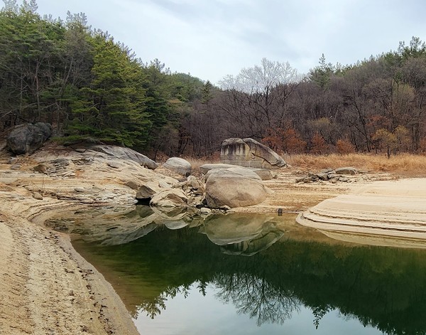 황홀한 풍광은 언제나 에너지를 던져준다. 깊은 골 끝에 근사한 바위가 멀리서 보인다. 다행히도 올라야 할 바위는 아니다. 물가 뒤편에 수직으로 서있는 큰 바위가 있고 그 앞에 수평으로 누워있는 널찍한 바위가 쉬어가라, 한다. 환상적인 포인트다. 햇살 좋은 날 멍 때리기 딱 좋다. 상상도 해본다. 늦은 밤 여기에 누워 보는 밤하늘, 별이 쏟아진다.