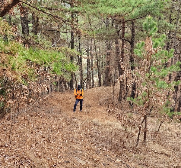지도에 천장골이라 표시된 곳 부근 깊고 넓은 골을 통과한다. 지도보다, 생각보다 깊다. 길다. 사기가 한 풀 꺾인다. 그래도 여기만 지나면 결승선 골인의 쾌감을 맛보리라, 기대 그대로의 기대는 심신을 부추긴다. 다시 걷는다. 저 앞에 나무 몇 그루가 언덕 위에 폼나게 서있다. 멋있다.