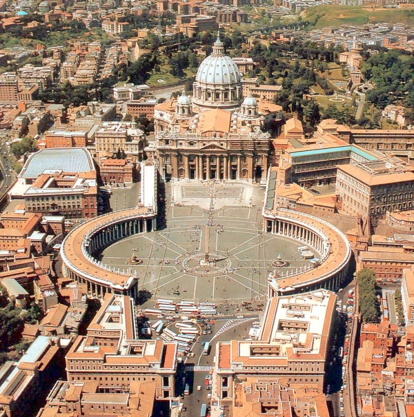 서울 경복궁 넓이만한 사방 700m가 채 되지 않는 0.44㎢(약 15만 평)에 800명이 사는 세계에서 가장 작은 독립국 바티칸은 국방은 이탈리아에 위임하고, 내부는 1506년부터 스위스 출신 용병 100여 명이 지키고 있다. 바티칸은 326년 콘스탄티누스 대제에 의하여 67년 네로 황제에 의하여 처형된 베드로의 무덤 위에 베드로 성당을 세웠는데, 바실리카 양식의 성당은 가로 137m, 세로 210m 크기였다. 예수의 열두 제자 중 하나인 베드로는 십자가에 거꾸로 매달려 처형됐는데, 그는 로마교회의 주교여서 그를 초대 로마교황이라고 한다.