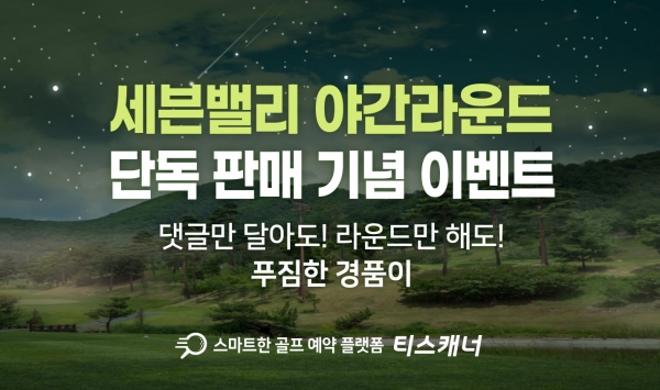 티스캐너는 이번 세븐밸리CC 야간라운드 예약 단독 오픈을 기념해 다양한 이벤트를 준비했다. 내달 야간라운드 진행 시 1팀당 골프공 1더즌, 크린토피아 세탁상품권 1만 원권 1매, 한화손해보험 홀인원 골프보험을 무료로 제공한다. 또 내달 30일까지 ‘세븐밸리 야간라운드 단독 판매 기념 이벤트’ 페이지 내 출제된 퀴즈 정답을 댓글로 달면 골프존 계열사에서 현금처럼 사용 가능한 골프존 마일리지 1000M를 전원에게 제공한다.